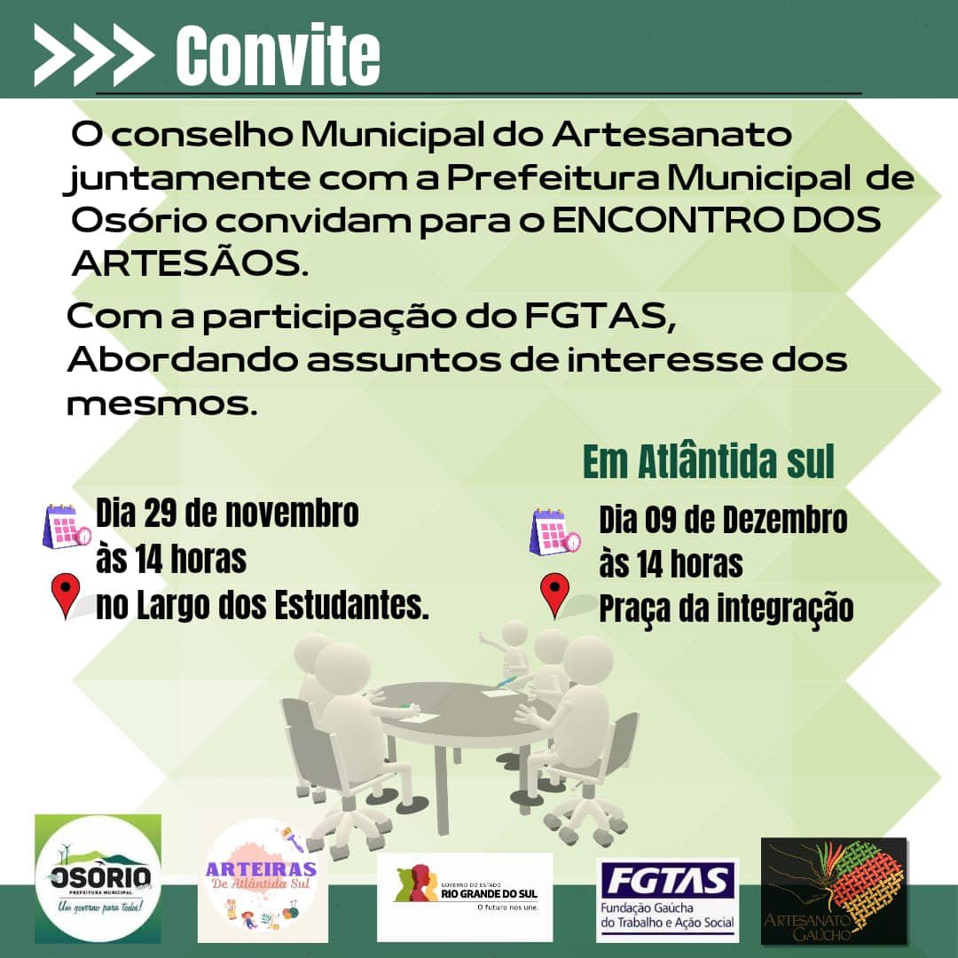 O Conselho Municipal do Artesanato juntamente com a Prefeitura Municipal de Osório convidam para o Encontro dos Artesãos, que acontece nesta quarta-feira, dia 29, no Largo dos Estudantes.