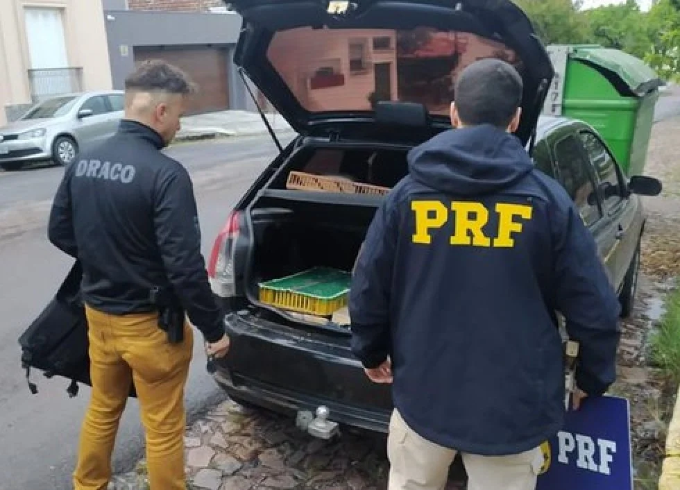 A Polícia Rodoviária Federal (PRF) e a Polícia Civil gaúcha resgataram aproximadamente 150 aves silvestres que eram transportadas ilegalmente em gaiolas dentro do porta-malas de um automóvel Fiat Palio em trecho da BR-293 em Bagé (Região da Campanha).