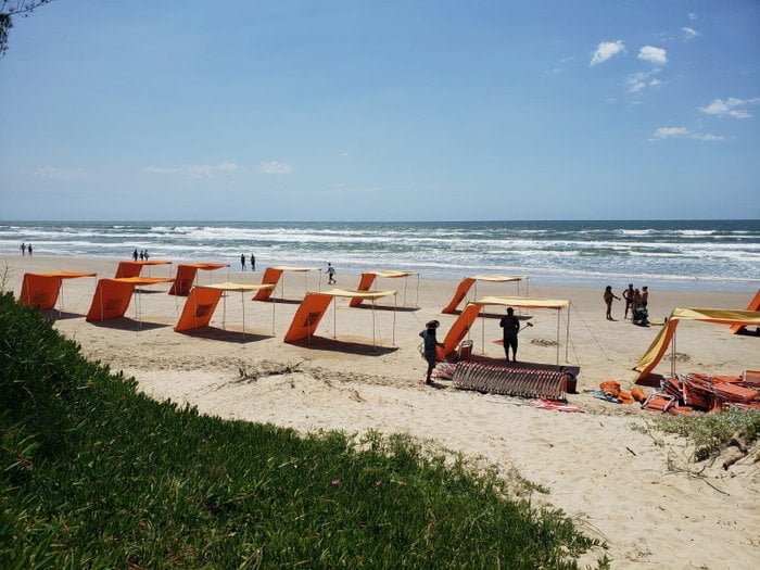 Estruturas montadas para garantir lugar a condôminos desagradam antigos veranistas da praia de Xangri-lá.