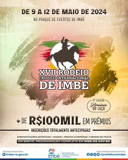 O XVII Rodeio Crioulo Internacional de Imbé já tem data definida: será entre os dias 9 e 12 de maio, no Parque Municipal de Eventos.