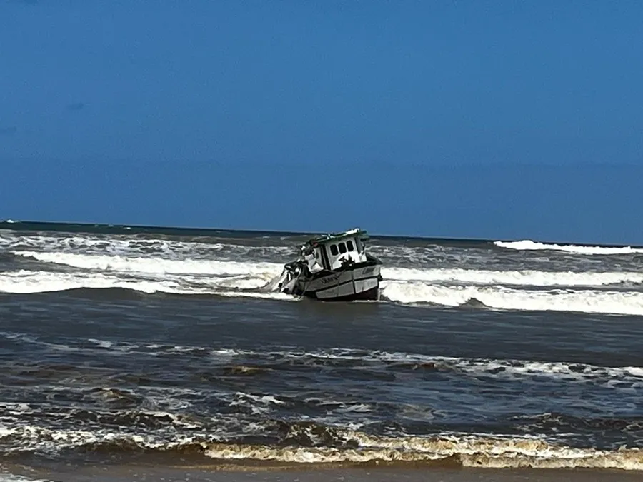 Entretanto, o mar ficou agitado e com ondas de aproximadamente 2 metros, o que dificultou a navegação e na entrada da barra, próximo ao canal, o barco encontrou um banco de areia, virou e ficou encalhado. ” Começou a entrar muita água no barco e ficamos apavorados, logo a seguir veio uma moto aquática dos guarda-vidas e fomos salvos.” disse um dos tripulantes. Muitos equipamentos que estavam no barco foram perdidos e a rede com cerca de 3 milhas de comprimento ficou presa ao barco.
