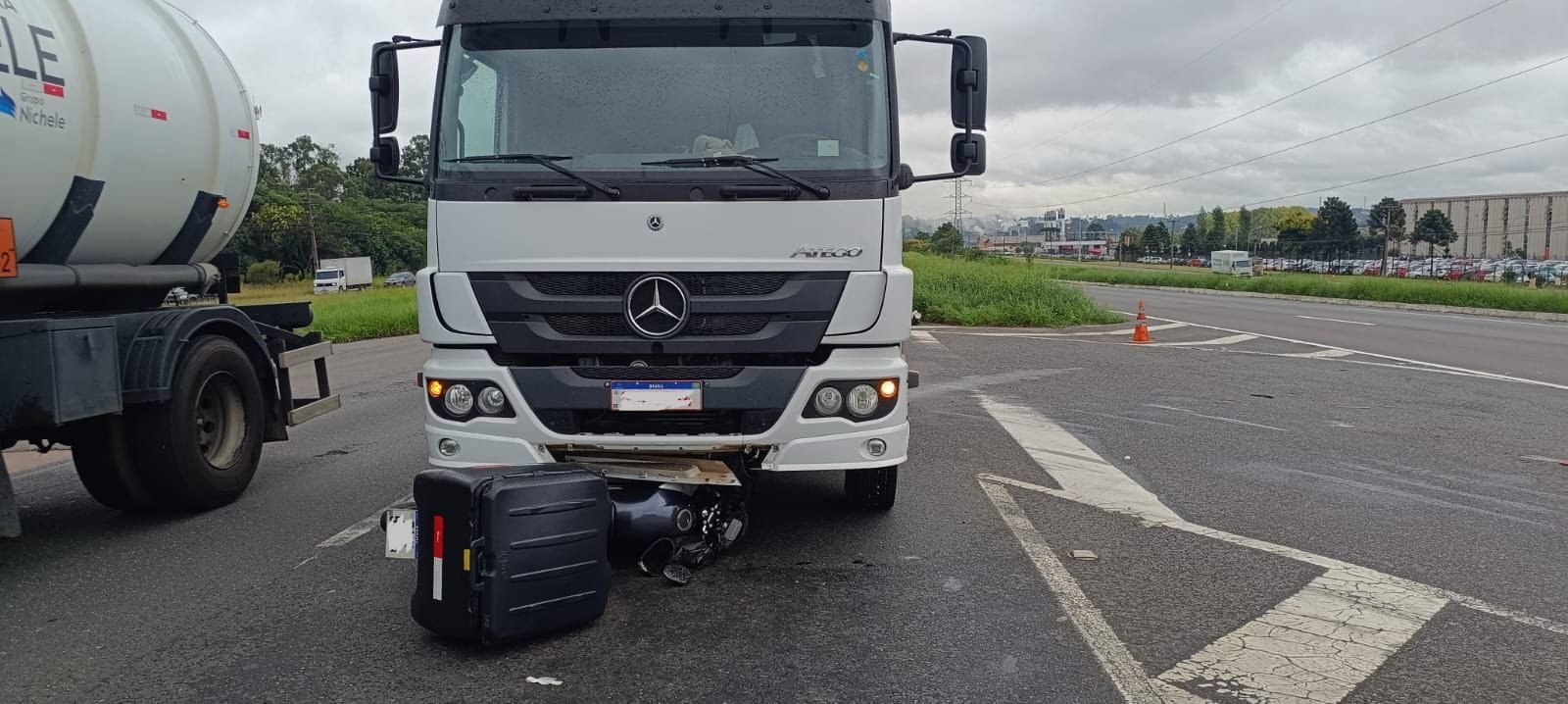 Parei para prestar o primeiro atendimento, porém os ferimentos eram incompatíveis com a vida. A princípio, o motociclista teve uma queda em frente ao caminhão, vindo o mesmo passar por cima da vítima.