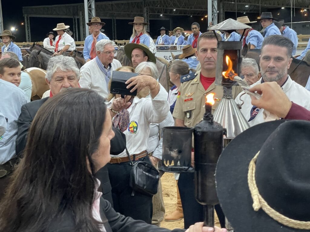 O ponto alto da cerimônia foi a chegada da Chama Crioula, que percorreu 230 quilômetros, trazida pelos cavaleiros da 5ª Região Tradicionalista de Santa Cruz do Sul, cidade que sediou o encontro no ano passado. A coordenadora da 5ª Região Tradicionalista Marisa Dal’Osto Rossa e o Diretor Paulo Machado, comandante da cavalgada fizeram a entrega da Chama Crioula para a Coordenadora da 12ª Região Tradicionalista, Marcia Rosane Monteiro, que, juntamente com seu Diretor de Cavalgadas, Valdir Soares Pereira, acenderam o candeeiro crioulo da festa, a quem cabe a responsabilidade de guardar a chama e em 2025, entregá-la ao coordenador que sediará a próxima FECARS.
