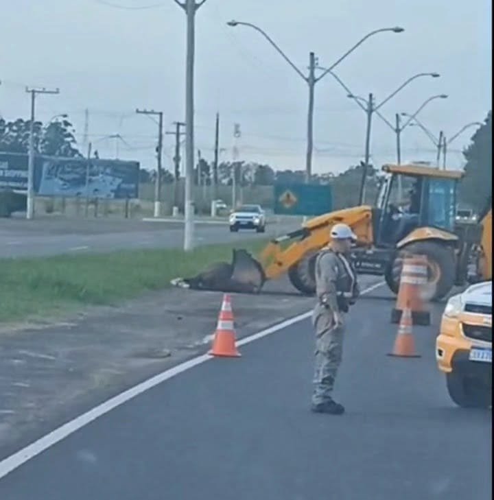 Na manhã desta quarta-feira, um veículo colidiu com um cavalo na RS-030, em frente ao Parque de Eventos Jorge Dariva, em Osório.