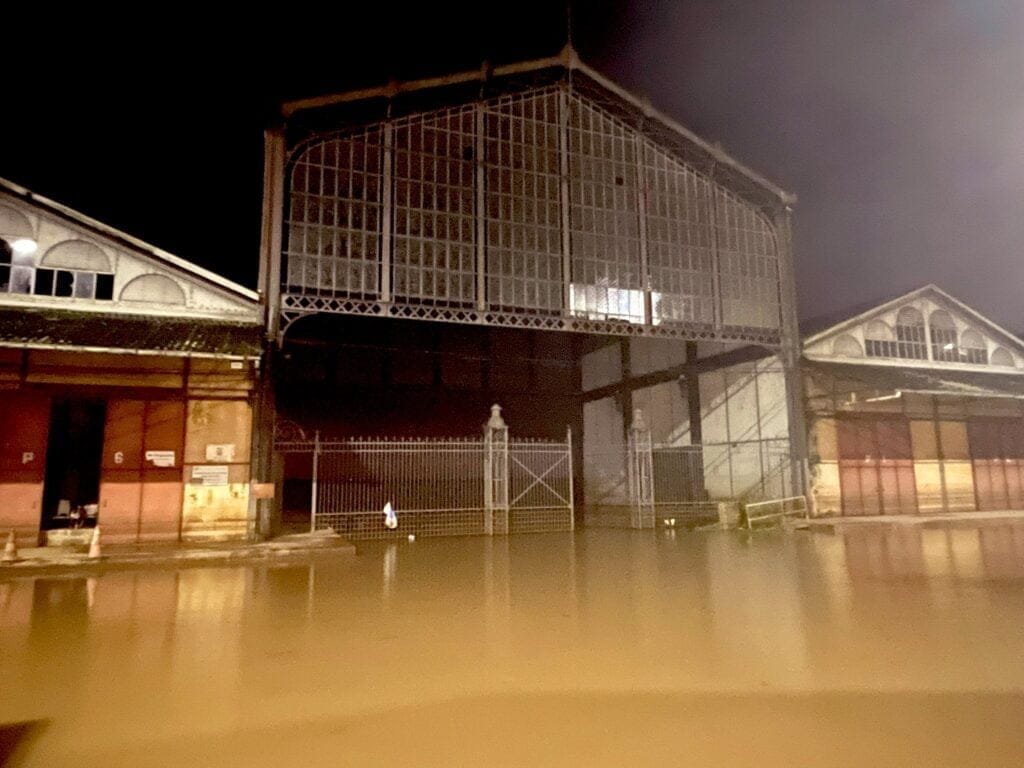 Direto das ruas. Guaíba sobe rapidamente e se aproxima do piso da Avenida Mauá no pórtico do Cais Central com a comporta principal aberta. 📷@metsul