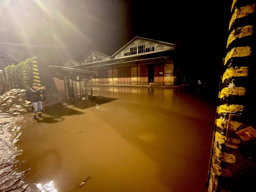 Às 21h30, a água já alcançava a calçada da avenida Mauá, saindo pela comporta 4 que está aberta.