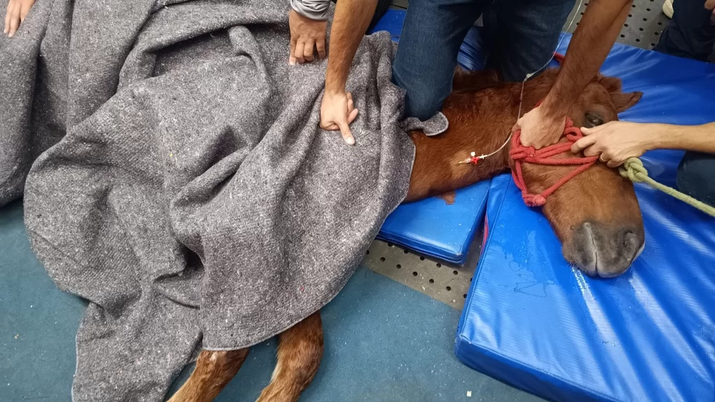 Veterinários do Exército acompanham a operação e trataram o cavalo durante o transporte até um local seguro.