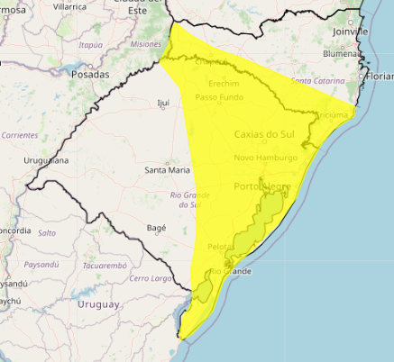 Primeiramente, há previsão da continuidade até às 15h das tempestades para a faixa Norte do território gaúcho. Este alerta é amarelo, de baixa intensidade.