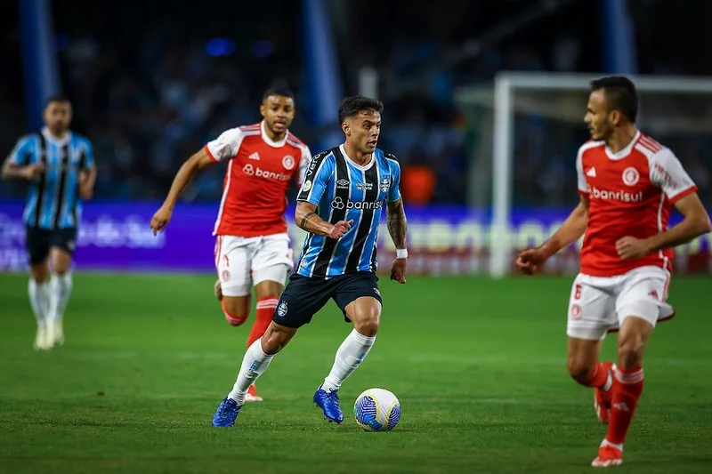 Em situação mais delicada no Brasileirão e jogando com o mando de campo, o Grêmio começou os primeiros minutos do clássico na pressão, tentando sufocar a defesa colorada e matar a saída de bola do time de Eduardo Coudet no nascedouro. A estratégia parecia boa e aproveitava a vitalidade de Gustavo Nunes e Pavón, mas não surtiu o efeito esperado, tanto que a primeira chegada mais contundente foi do Inter. Aos seis minutos, após boa trama de Wesley com Alan Patrick, a bola se ofereceu para Renê na entrada da área. O lateral engatilhou o pé e chutou, mas o arremate saiu mascado.