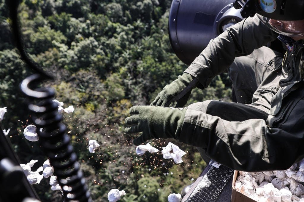 Durante a tarde, equipes utilizaram aeronaves do Exército e Polícia Rodoviária Federal (PRF), que auxiliaram no lançamento de três mil “bombinhas”, uma mistura de sementes nativas e forrageiras.