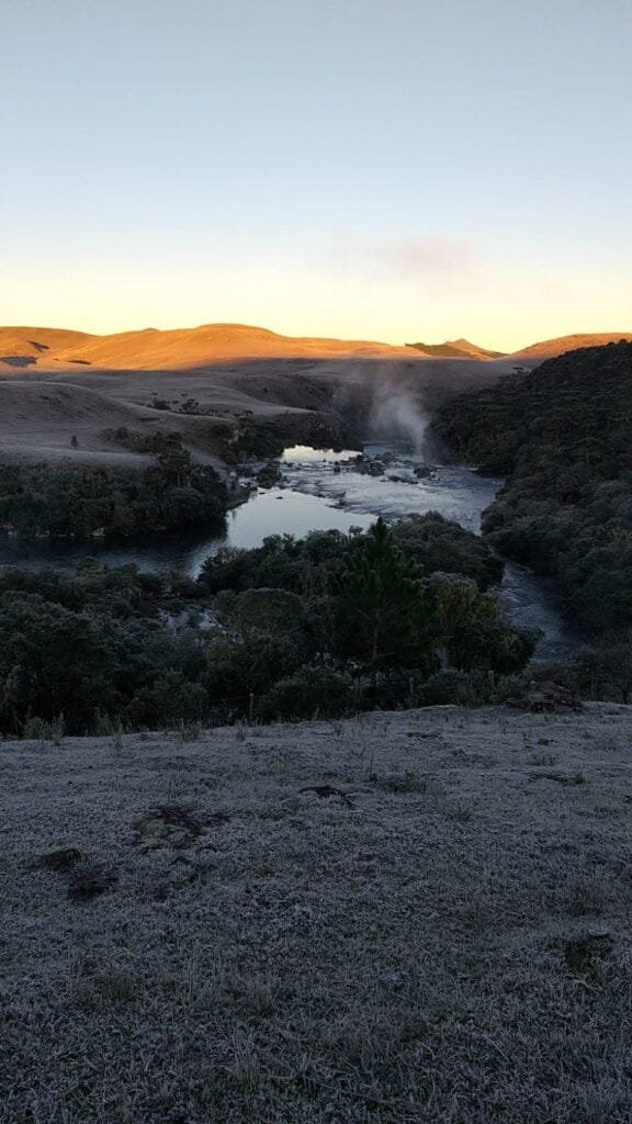 Amanhecer de hoje em São José dos Ausentes. Temperatura mínima foi de 5,3°C abaixo de zero. 📷 Samuel Salib Nackes/Pousada Cachoeirão dos Rodrigues