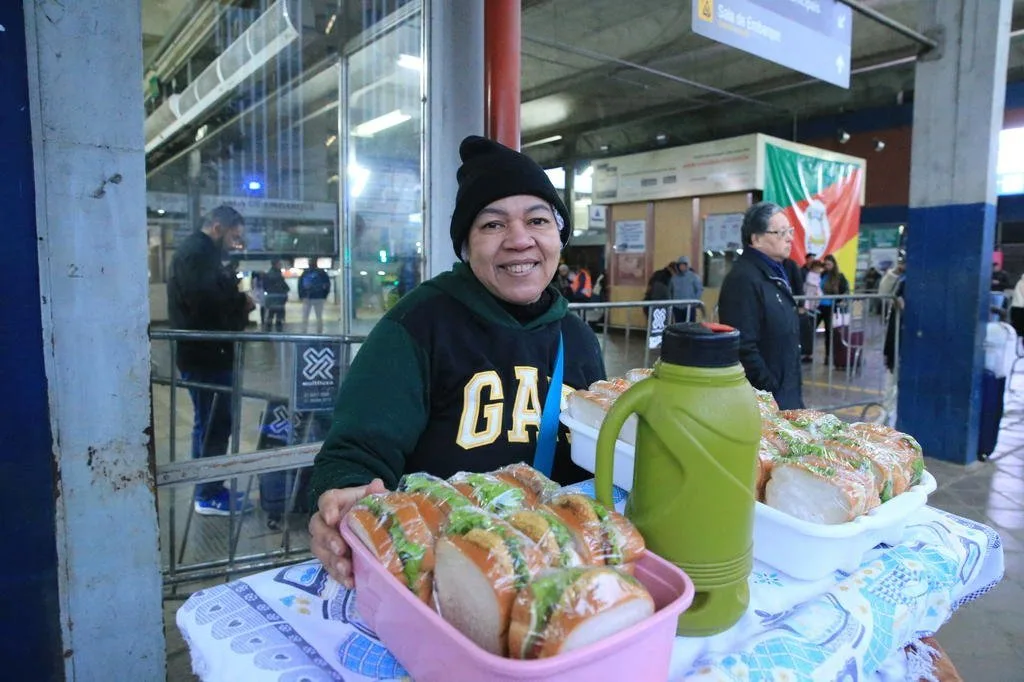 Com uma mesinha montada na rua perto do guichê de venda de passagens, a ambulante Ivanice Rita do Nascimento, 59 anos, servia café e vendia sanduíches para os usuários com um sorriso no rosto.