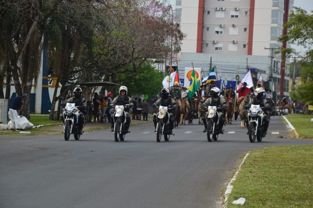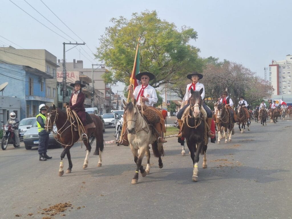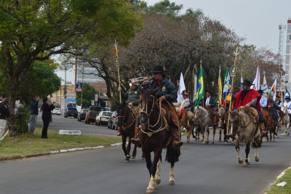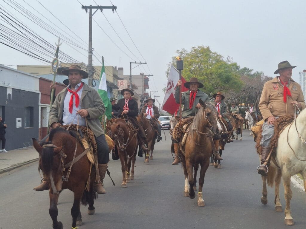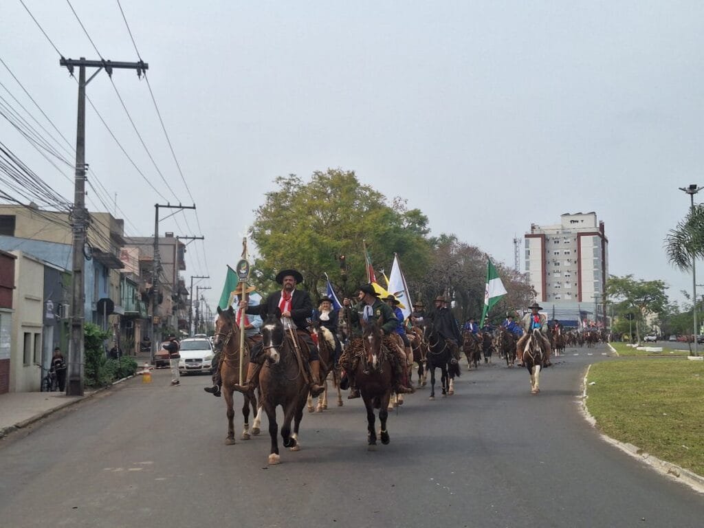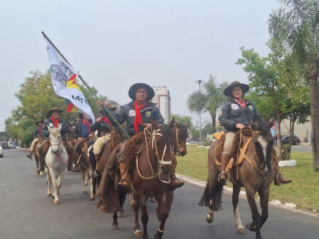 A partir daí, os cavaleiros seguiram em direção à região central da cidade, acompanhados por batedores da Brigada Militar e um padrinho tradicionalista do Baita Chão com cada RT.