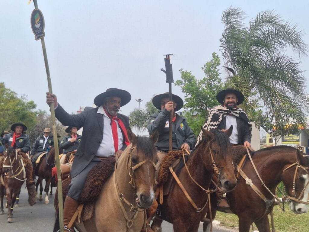 Os cavaleiros, montados com orgulho, empunhavam as bandeiras das três pátrias – Brasil, Uruguai e Argentina – além das bandeiras das regiões tradicionalistas e de Santa Catarina. Em meio ao cortejo, as vozes dos gaúchos se uniam em um canto espontâneo de “Canto Alegretense”, uma canção que, mais do que nunca, reforçava o sentimento de pertencimento e amor pela terra.