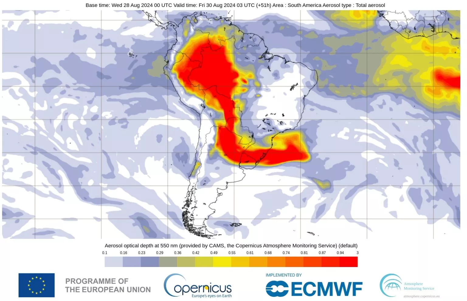 Modelos projetam um denso corredor de fumaça, resultante do grande número de queimadas que vem se registrando nestes dias na Amazônia do Brasil e de países vizinhos, rumando para Sul e atingindo a parte meridional do Brasil. O corredor de fumaça percorre milhares de quilômetros e abrange uma área que vai da região amazônica até o Rio Grande do Sul, passando pelos territórios da Bolívia, do Paraguai e do Nordeste da Argentina.