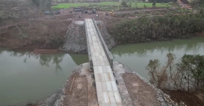 O 3º Batalhão de Engenharia de Combate do Exército Brasileiro concluiu, no domingo (4/8), a instalação da ponte provisória sobre o Rio Forqueta, interligando os municípios de Lajeado e Arroio do Meio. No entanto, o tráfego na estrutura será liberado apenas na quarta-feira (7), após as prefeituras finalizarem a instalação de placas de sinalização e concluírem os acessos necessários.