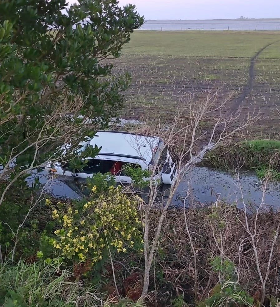 Um veículo saiu da pista no quilômetro 16, na altura do bairro Palmital, em Osório, em uma área alagada.