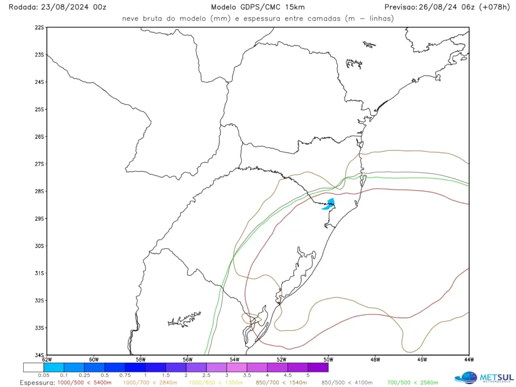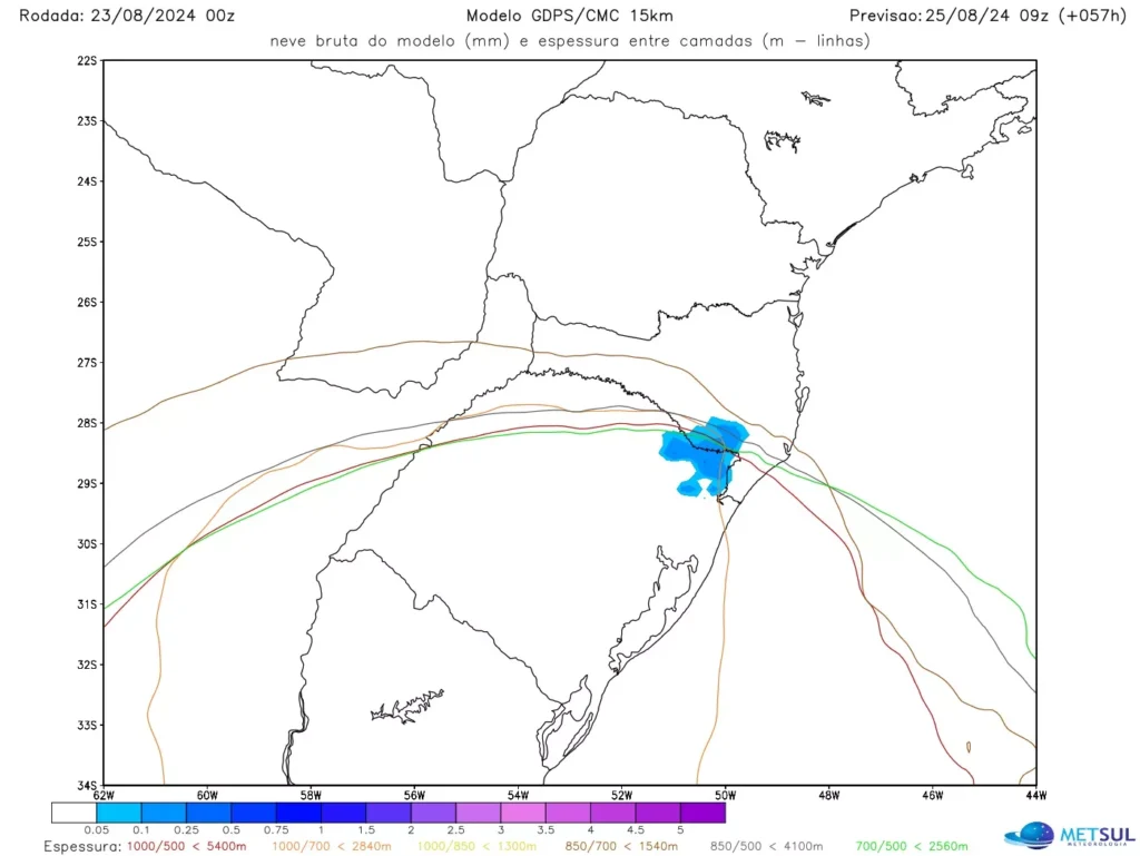 Os dados analisados pela MetSul Meteorologia indicam a maior probabilidade de neve até agora neste ano e entendemos que a chance de nevar é muito alta nos municípios de maior altitude do Sul do país, notadamente do Planalto Sul Catarinense.