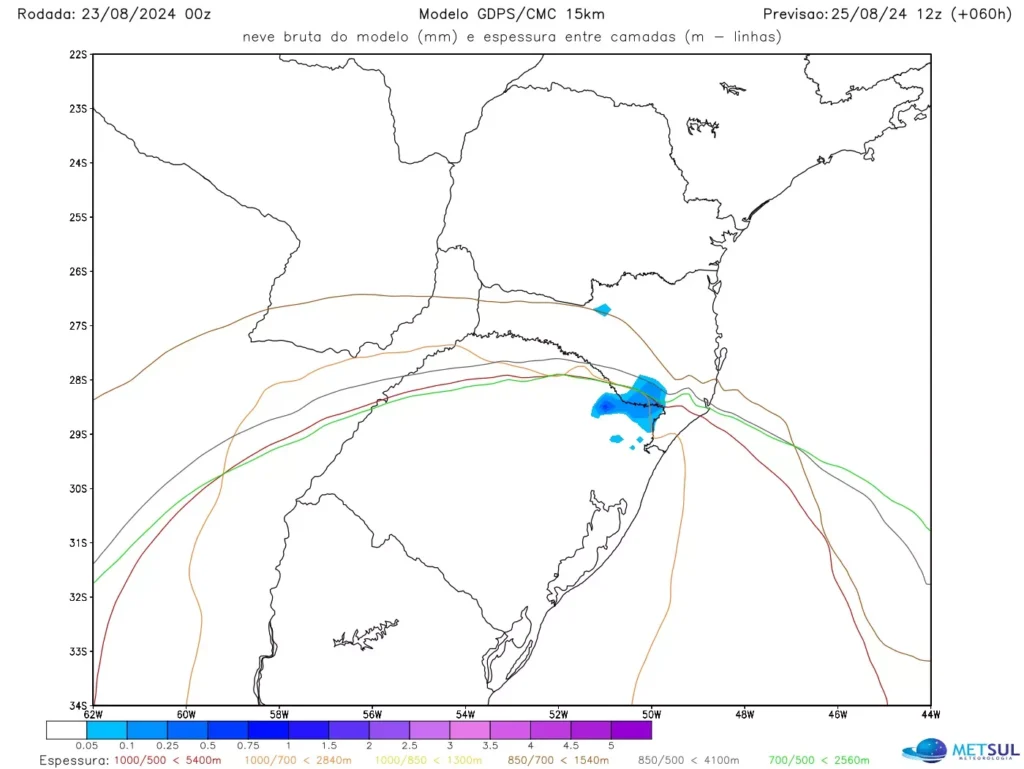 Em cotas de 600 metros a 1000 metros, o que inclui a Serra Gaúcha, não se descarta principalmente chuva congelada com eventual neve (chance mais baixa que nos Aparados) em pontos de cidades acima de 800 metros.