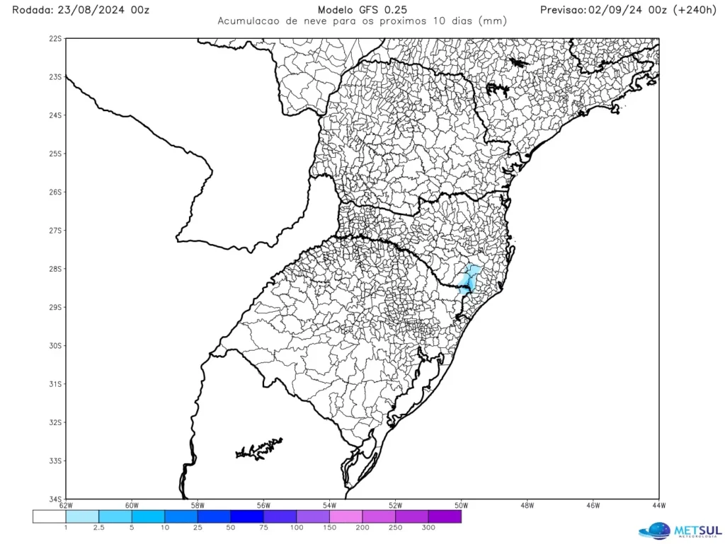 Nevou no começo deste mês na região de São Joaquim (SC) e São José dos Ausentes (RS), mas, confirmando-se os dados dos modelos, a precipitação desta vez tende a ser mais ampla e mais forte nestas regiões que são as de maior altitude do Rio Grande do Sul e Santa Catarina.