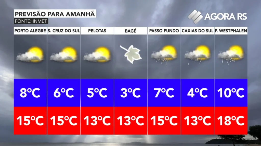 Na Serra, as mínimas ficam em torno de 0°C na Serra, com condições de chuviscos/chuva fraca e precipitação invernal em áreas altas da Serra gaúcha.