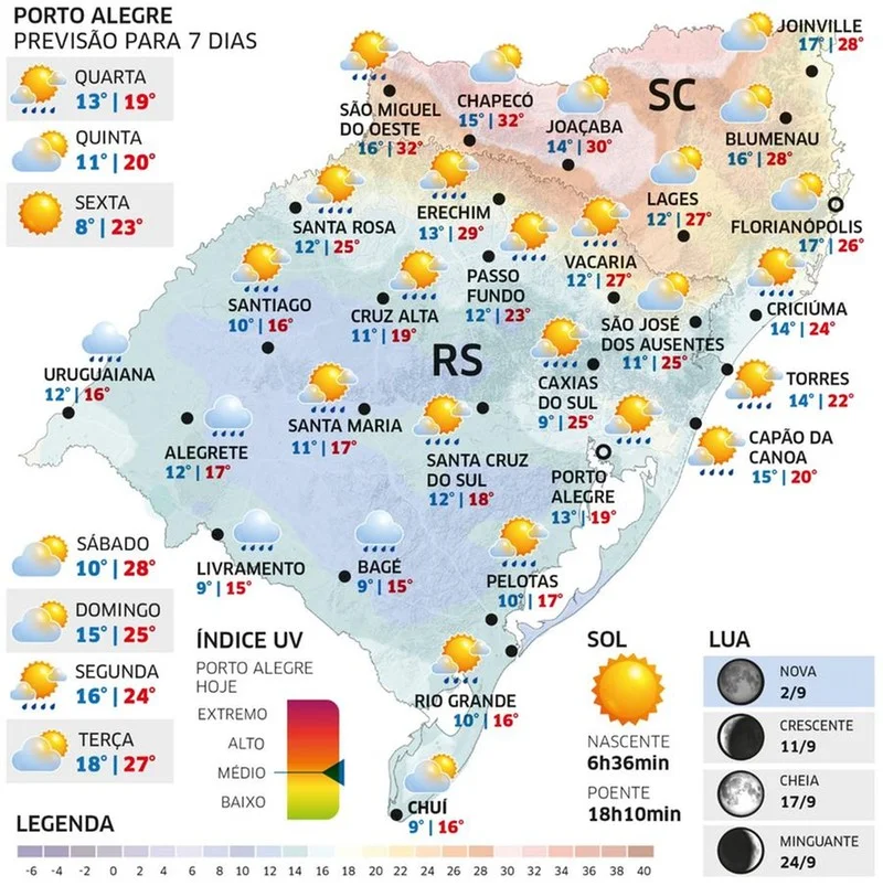 Uma frente fria muda o tempo no Rio Grande do Sul nesta quarta-feira, com aumento de nuvens e chuva na maioria das regiões até o final do dia.