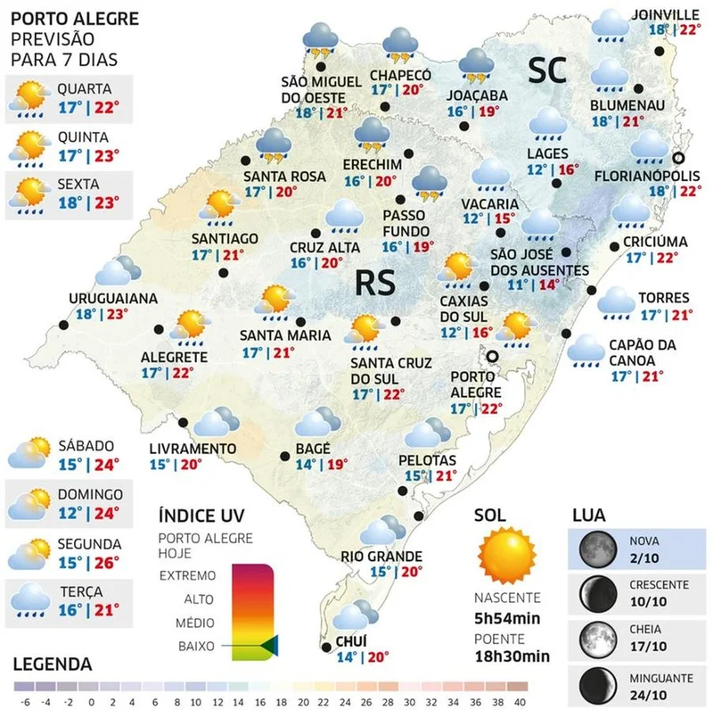 No Noroeste e no Norte gaúcho, chance alta de chuva por vezes forte com trovoadas e ocasionais temporais isolados.