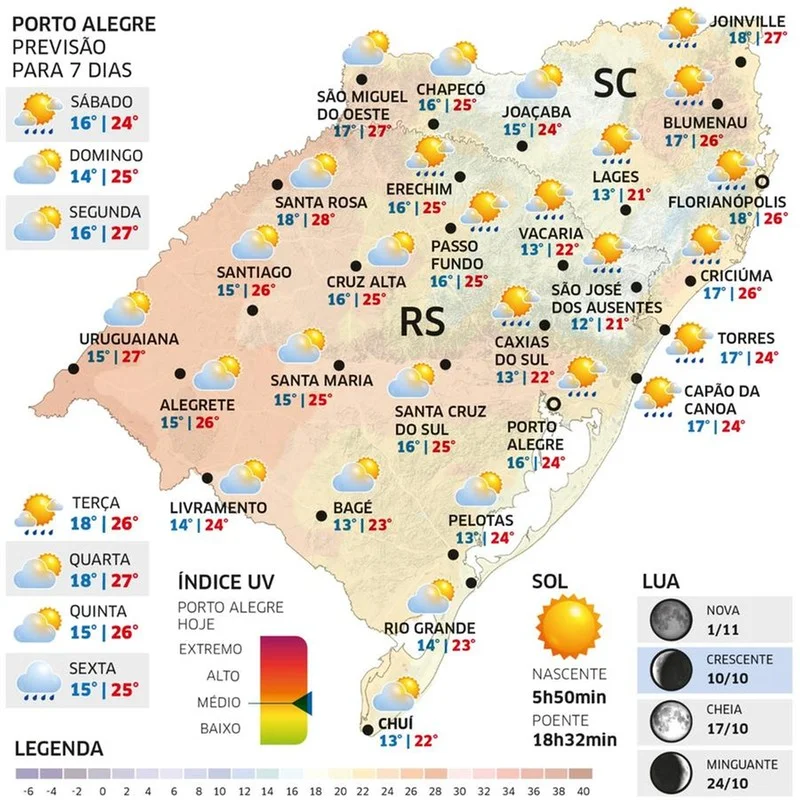 O sol aparece com nuvens no decorrer do dia em todas as regiões gaúchas, mas em parte do dia algumas áreas ainda devem ter momentos de maior nebulosidade.