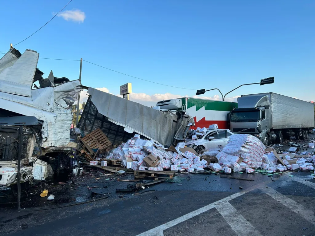 Alguns dos veículos estavam carregados de produtos, como garrafas de vinho e cebola, que acabaram espalhados pela via.