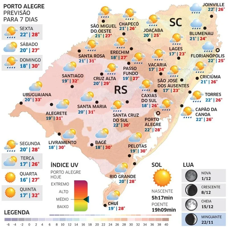 Com o ar tropical, a sexta-feira será quente e abafada no Rio Grande do Sul. Várias regiões devem ter máximas durante a tarde perto dos 30ºC, mas com sensação térmica maior por conta da alta umidade.