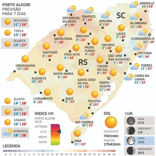 A temperatura máxima deve ultrapassar os 20°C na maioria dos municípios gaúchos.
