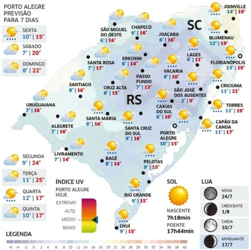 Conforme a MetSul Meteorologia, ainda há possibilidade de chuva fraca, principalmente no período da manhã, em regiões como o Centro, Sul e o Leste gaúcho, o que inclui Porto Alegre e a região metropolitana.