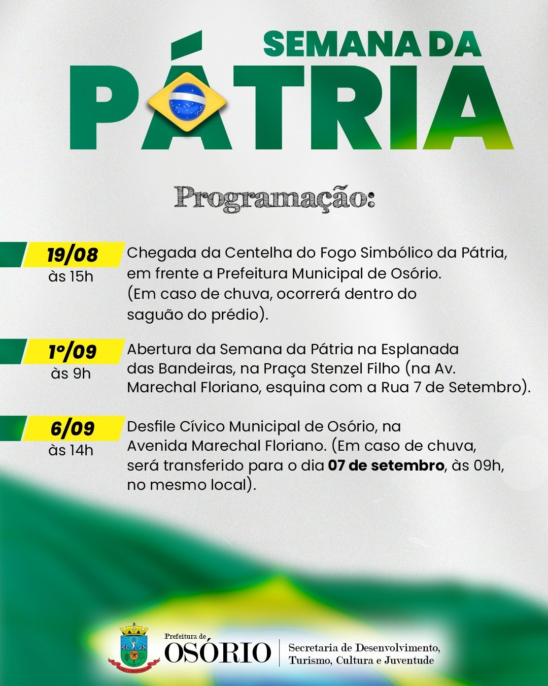 Na próxima terça-feira (19/08), às 15h, na frente do prédio da prefeitura de Osório, ocorre uma solenidade para a recepção da centelha do Fogo Simbólico da Pátria que, a partir do dia 1º de setembro, início das festividades, será acesa a pira na Esplanada das Bandeiras com a execução dos hinos e hasteamento das bandeiras, dando início às festividades.
