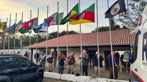 Em seguida, houve o arriamento das bandeiras e a execução do Hino Nacional, em respeito às tradições e à identidade do Rio Grande do Sul e do Brasil.