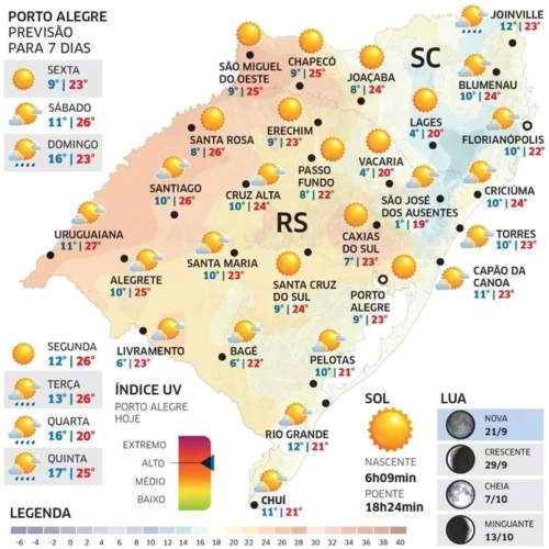 Em ausentes, a temperatura varia entre 1ºC e 19ºC, enquanto em Porto Alegre oscila de 9ºC a 23ºC. Já em Caxias do Sul, as marcas ficam entre 7ºC e 23ºC e em Bagé entre 6ºC e 22ºC. Em Cruz Alta fica entre 9ºC e 24ºC e em Santa Rosa entre 8ºC e 26ºC.