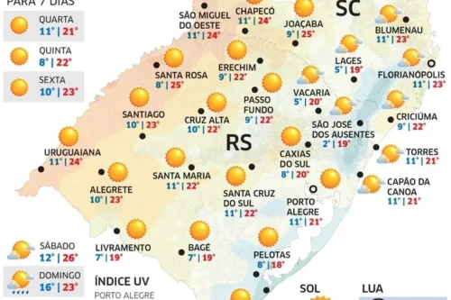 O dia começa frio, mas as temperaturas sobem e tornam a tarde amena. Em Porto Alegre, a temperatura fica entre 11°C e 21°C.