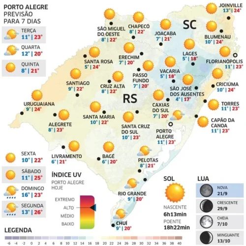 Em Porto Alegre, as temperaturas ficam entre 11°C e 23°C.