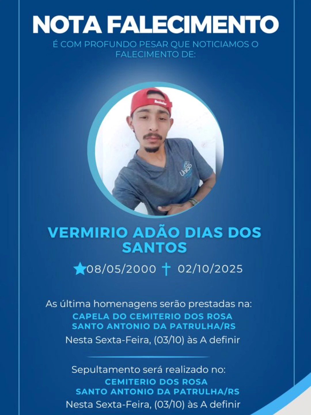 Os atos fúnebres da vítima ocorrem nesta sexta-feira (3), em Santo Antônio da Patrulha.