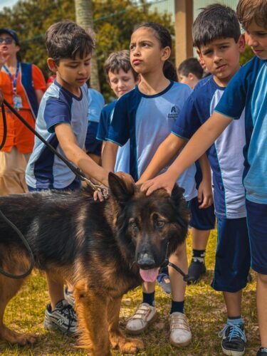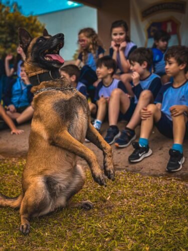 As crianças puderam acompanhar como os animais são preparados para atuar em ocorrências como buscas, faro de entorpecentes e apoio em operações.