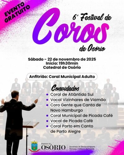 A cidade será palco do 6º Festival de Coros de Osório e do 3º Festival de Coros Infantojuvenis, reunindo grupos vocais de diversas regiões do Rio Grande do Sul.