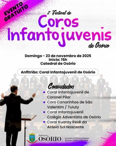 O evento será conduzido pelo Coral Infantojuvenil de Osório, que recebe corais de diferentes cidades em uma tarde dedicada ao talento e à musicalidade das novas gerações.