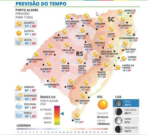 Em Passo Fundo, a temperatura oscila entre 16ºC e 30C, em Uruguaiana fica entre 20ºC e 34ºC e em Bagé entre 15ºC e 30ºC.