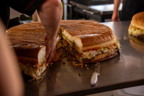 Depois de finalizado, o tradicional lanche santa-mariense de quase 33 kg foi cortado e distribuído aos presentes.