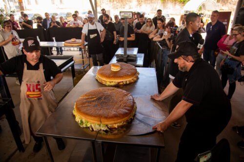 Produzido ao vivo, o xis levou cerca de uma hora para ficar pronto. Para dar conta do tamanho, os bifes e os pães precisaram ser confeccionados especialmente para a ocasião.