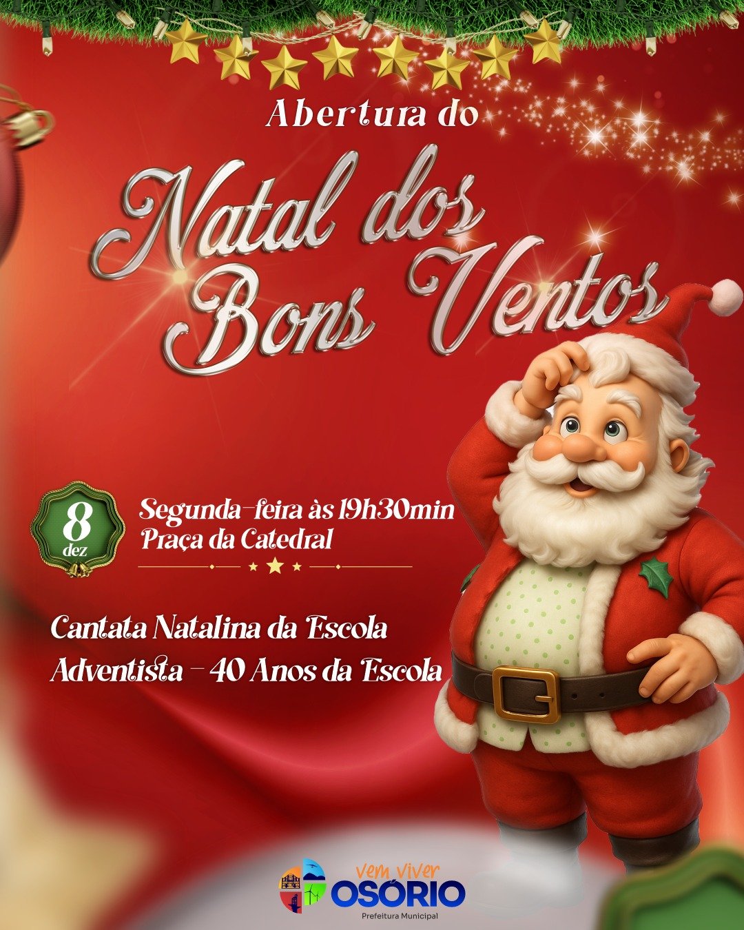 Na próxima segunda-feira (08/12), feriado municipal da padroeira da cidade, Nossa Senhora da Conceição, vai ocorrer a abertura oficial da programação cultural do Natal dos Bons Ventos, a partir das 19h30min, com a Cantata Natalina da Escola Adventista, na escadaria da Catedral.