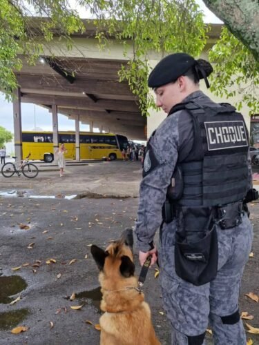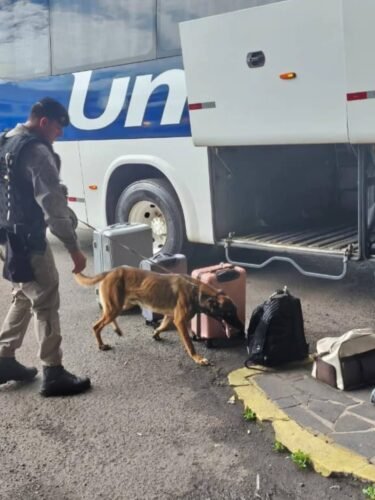 Para a fiscalização nos ônibus, foram empregados cães de detecção dos Canis do CRPO Litoral e do 1º Batalhão de Polícia de Choque (1º BPChq), conduzidos por seus respectivos binômios.