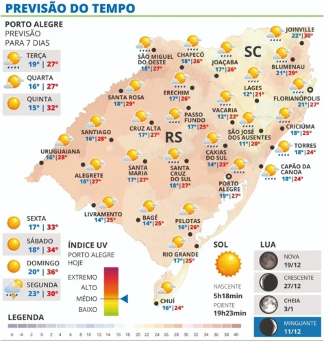 Em Caxias do Sul a temperatura oscila entre 14ºC e 23ºC, já em Ausentes as marcas variam entre 11ºC e 20ºC e em Vacaria entre 12ºC e 22ºC. Em Porto Alegre, o dia terá variável de sol e chuva, com máxima de 27ºC e mínima de 19ºC.