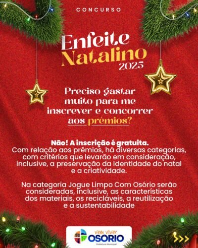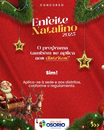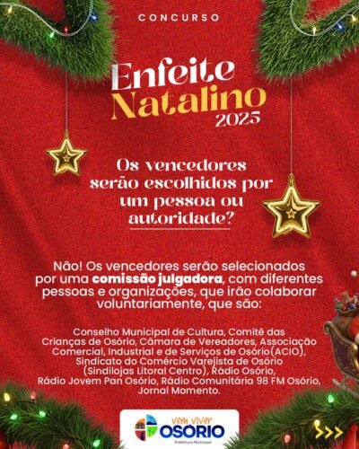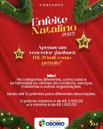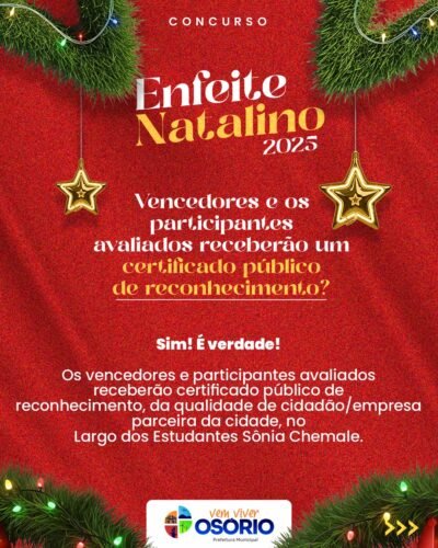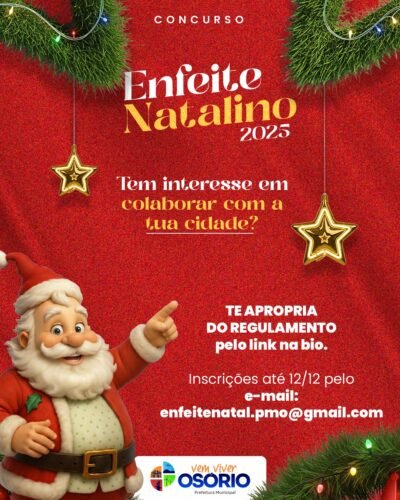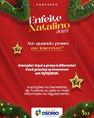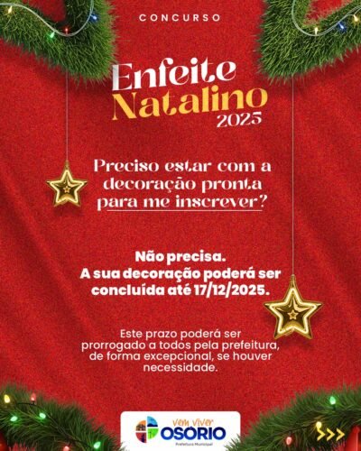 🎄✨ A decoração não precisa estar finalizada para se inscrever.A Prefeitura de Osório prorrogou até o dia 12 de dezembro (sexta-feira), as inscrições para o programa de premiação “Enfeite Natalino”.