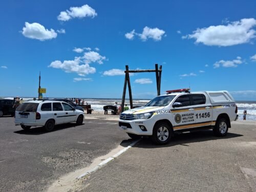 Uma viatura da Brigada Militar está na orla e a orientação é que banhistas evitem entrar no mar devido à ressaca que ainda persiste.