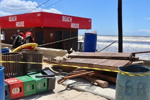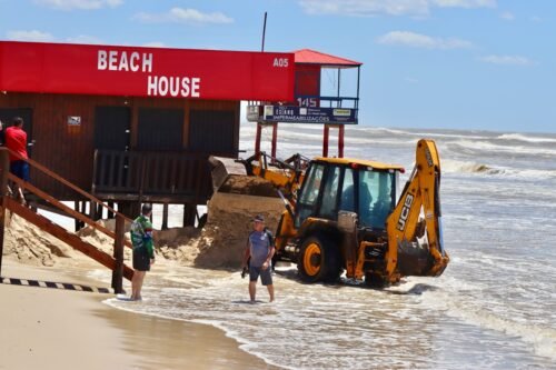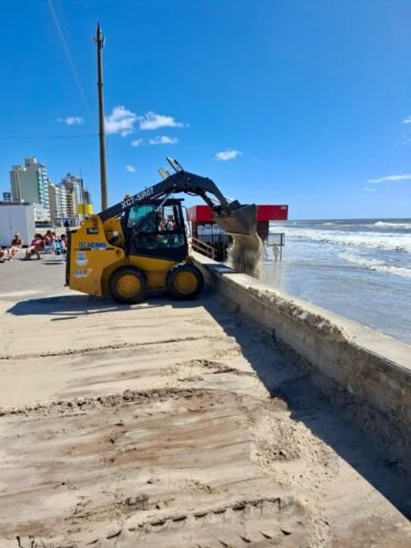 As equipes realizaram amarrações nas estruturas e a colocação de contenções de areia, com o objetivo de impedir que o mar continuasse avançando sobre os quiosques.